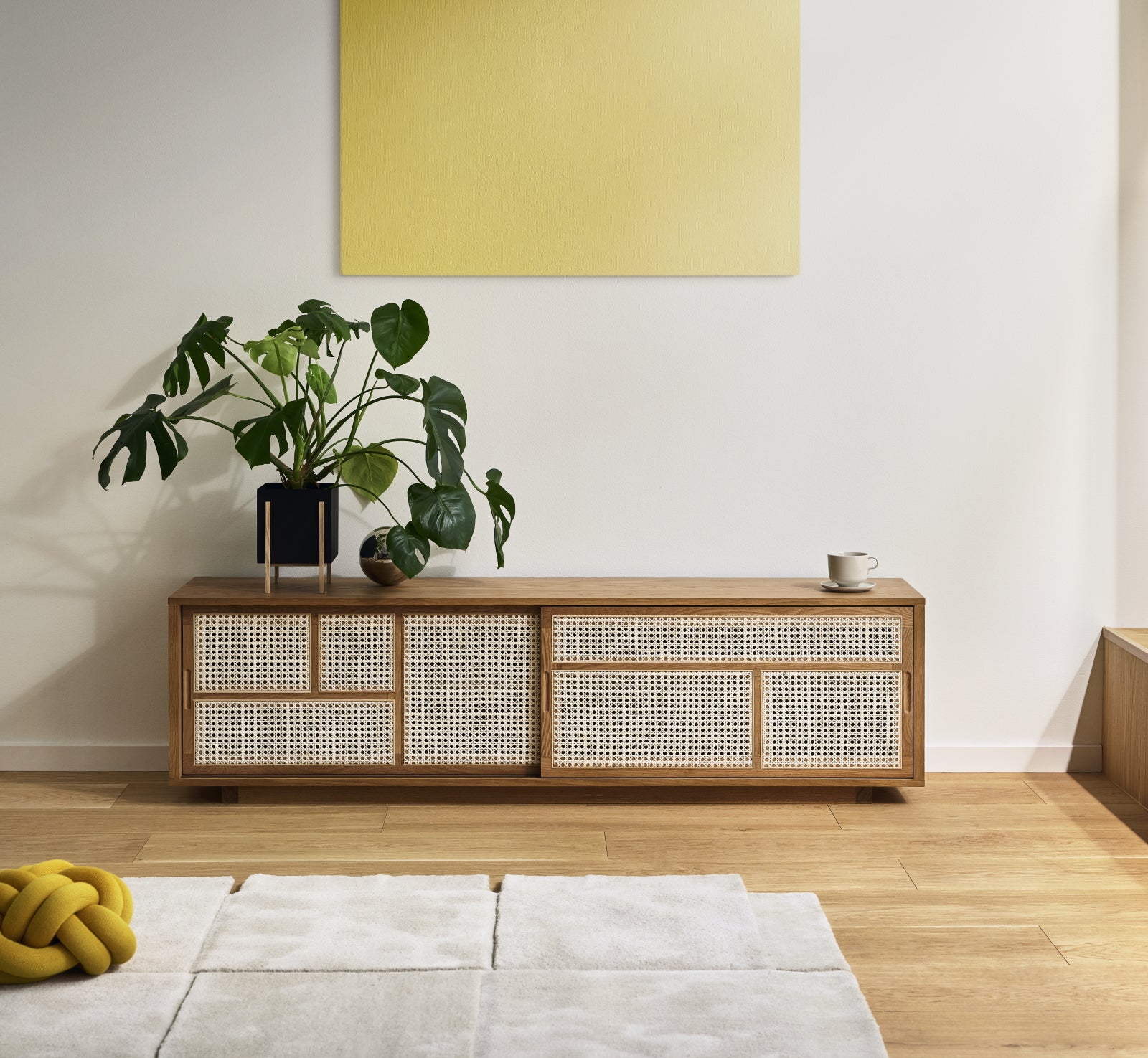 Designer Mathieu Gustafsson plays with airy transparency and three-dimensionality with woven rattan for a semi-transparent look that is both contemporary and retro. The Sideboard can be outfitted with lighting inside to amplify the sensation. The access holes also allow for easy wiring of electric appliances and various media devices. Measures 1.8m (W) x 38cm (D) x 50cm (H).