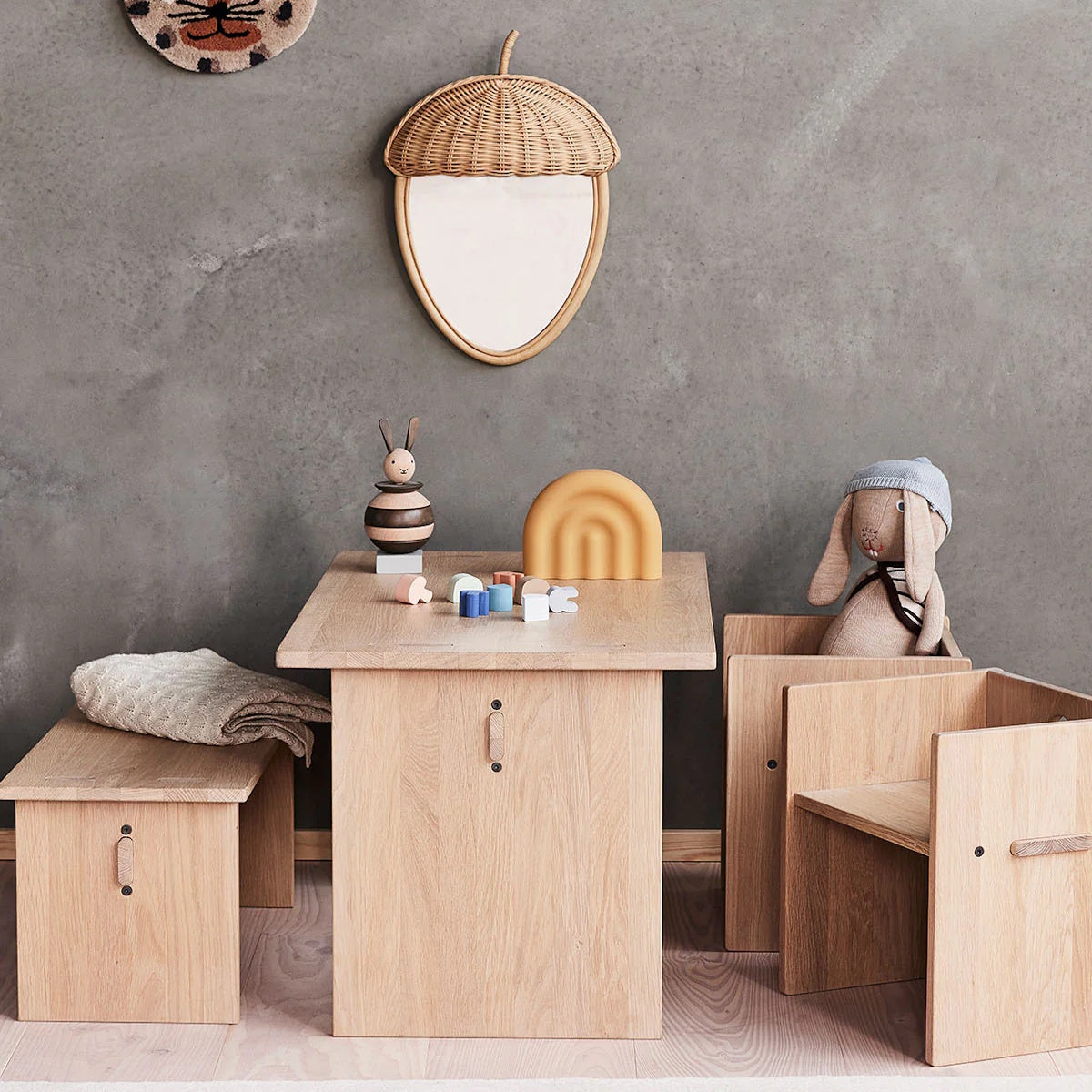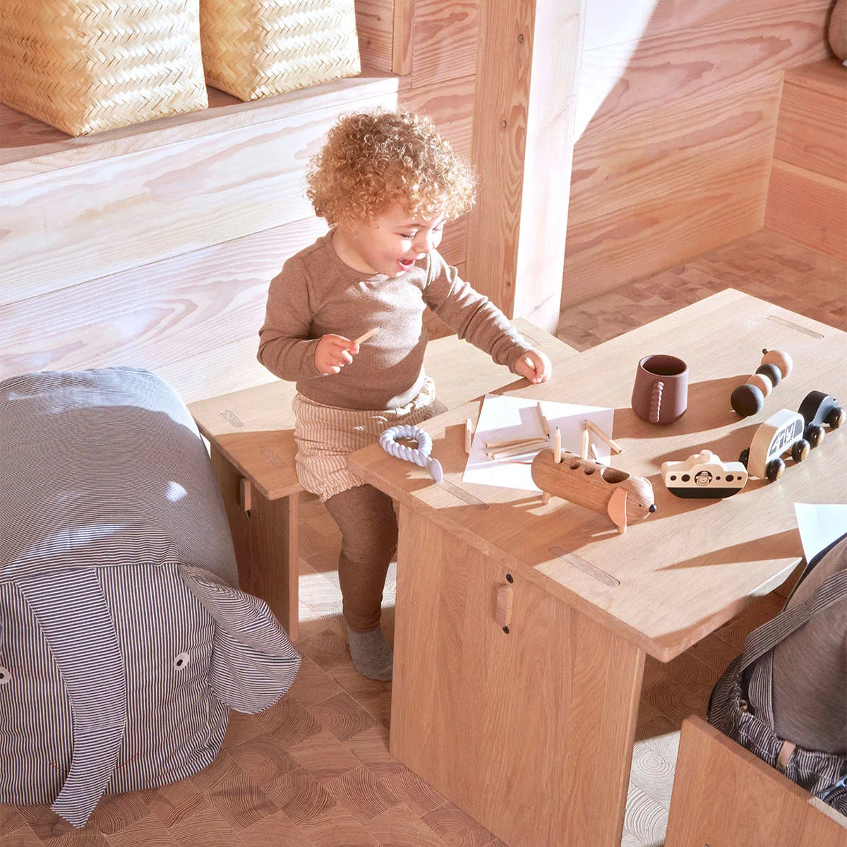 Arca is a series of furniture made for children in treated solid oak produced in Europe. With a simple and minimalist design, the bench will be a functional and neat element in the children's room. Combine the bench with the rest of the furniture from the Arca series. The bench is delivered as flat pack and is easy to assemble. Bench measures H29cm x L67cm x W29cm.