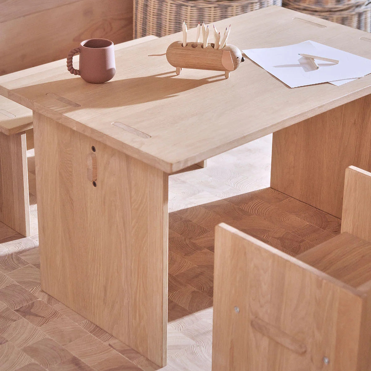Arca is a series of furniture made for children in treated solid oak produced in Europe. With a simple and minimalist design, the small table will be a functional and neat element in the children's room. Combine the table with the rest of the furniture from the Arca series. The table is delivered as flat pack and is easy to assemble. Table measures H46cm x L82cm x W50cm.