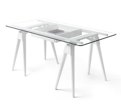Working in style. Designer Chuck Mack has created a desk supported on trestles. The glass worktop makes all the nice stuff you have in your drawer visible. The construction might seem simple, but Arco has several design features; the frame is attached to the trestles by wooden plugs to secure stability. The drawer is accessible from both sides of the table, and the tempered glass worktop has smooth, rounded edges to avoid accidents, and rests on small plastic distances that makes it stable.