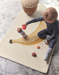 Keep small feet warm with the cute Banana Tufted Rug and use it for hours of playtime on the floor. The rug is made of 80% wool and 20% cotton. The Banana has a 3D effect to give the rug tactile properties. Measures 140cm (L) x 80cm (W).