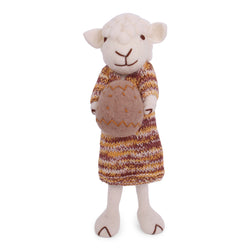 Dressed in a cosy, multicoloured knitted dress that radiates playful texture and colour, this adorable sheep holds a felted egg adorned with intricate patterns and embroidery. Each piece is unique, making it a delightful addition to seasonal displays, a thoughtful gift, or a charming accent for everyday décor.