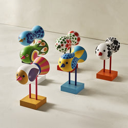 Originally created in 1967 by designer Lisa Larson, these vibrant wooden birds have become a beloved symbol of Scandinavian whimsy and craftsmanship. Each bird features bold, hand-painted patterns that transform wood into a playful art object. Presented on sleek pedestal stands, they bring joy and colour to shelves, counters and curated displays.
