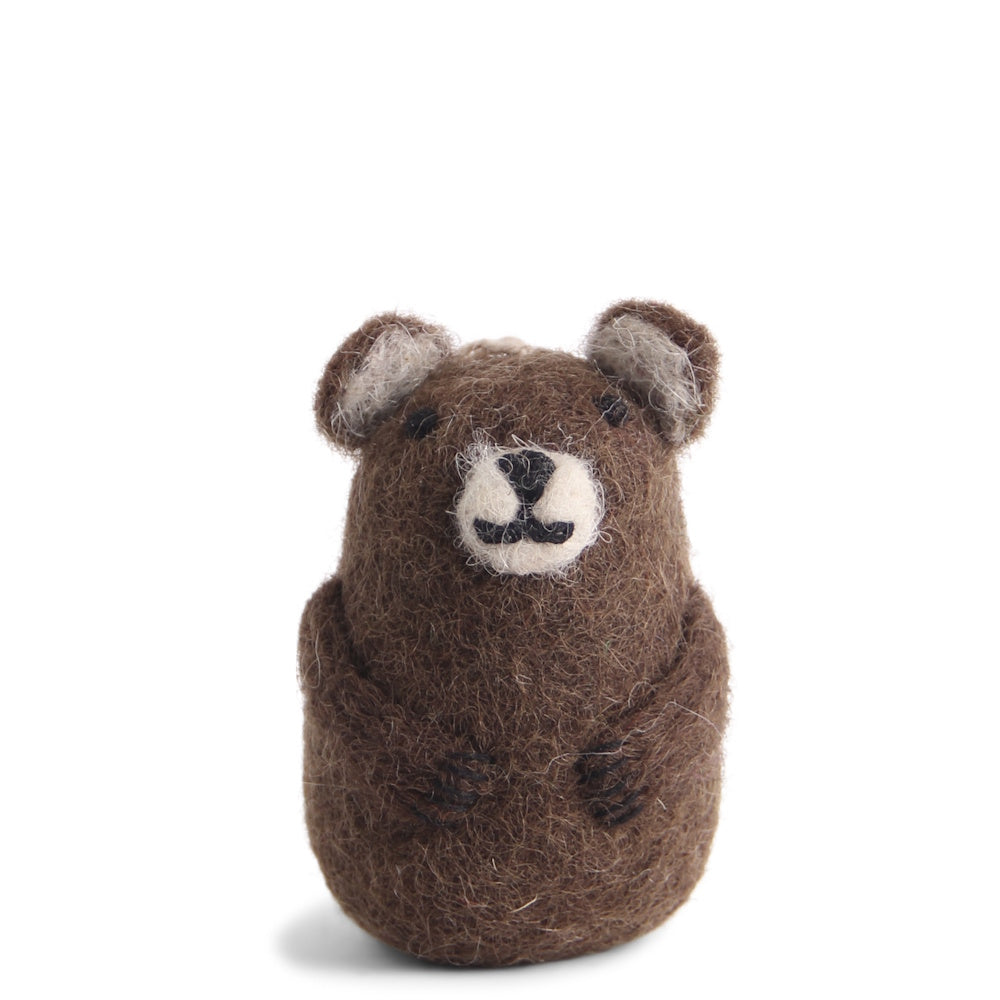 Meet the adorable Gry & Sif Brown Bear Mini – a charming felt decoration that brings a touch of woodland wonder into your home. This delightful little bear is crafted from natural brown wool felt, with detailed features including a sweet, stitched face, tiny ears and playful paws that make it irresistibly cute. Decoration measures 6cm in length.