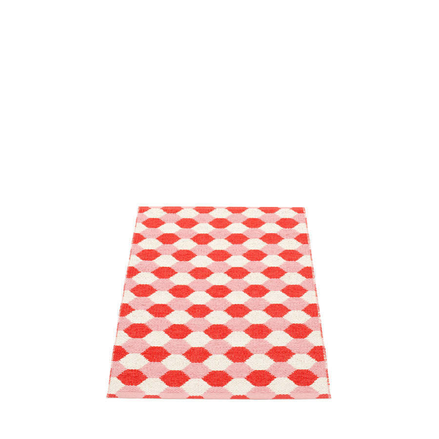 The DANA rug in Coral, Red Piglet, and Vanilla adds a vibrant, uplifting touch to interiors and outdoor spaces with its elegant diamond pattern and cheerful colour palette. Designed with versatility in mind, its reversible construction reveals two complementary colour schemes, allowing easy updates to your décor. Crafted from UV-resistant, water-repellent, and hypoallergenic materials, DANA is also machine washable and offers a soft, cushioned feel underfoot. Fire-rated Cfl-s1 and tested for commercial durability, this rug is a bold yet practical choice for residential, retail, and hospitality environments.