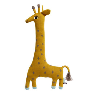 The Guggi Giraffe has a cute and playful look in rose and amber colours, making it adorable to look at and comfortable to cuddle with. Made of 100% cotton knit with a soft fibre filling. Measures H32cm x L15cm.