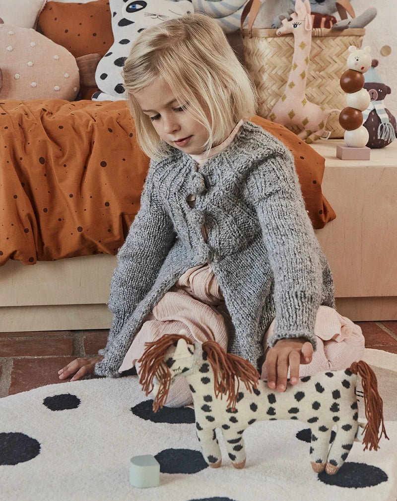 The Little Pelle Pony has a cute and playful look in black, white and brown colours. Made of 100% cotton knit with a soft fibre filling. Measures 21cm (H) x 26cm (L).