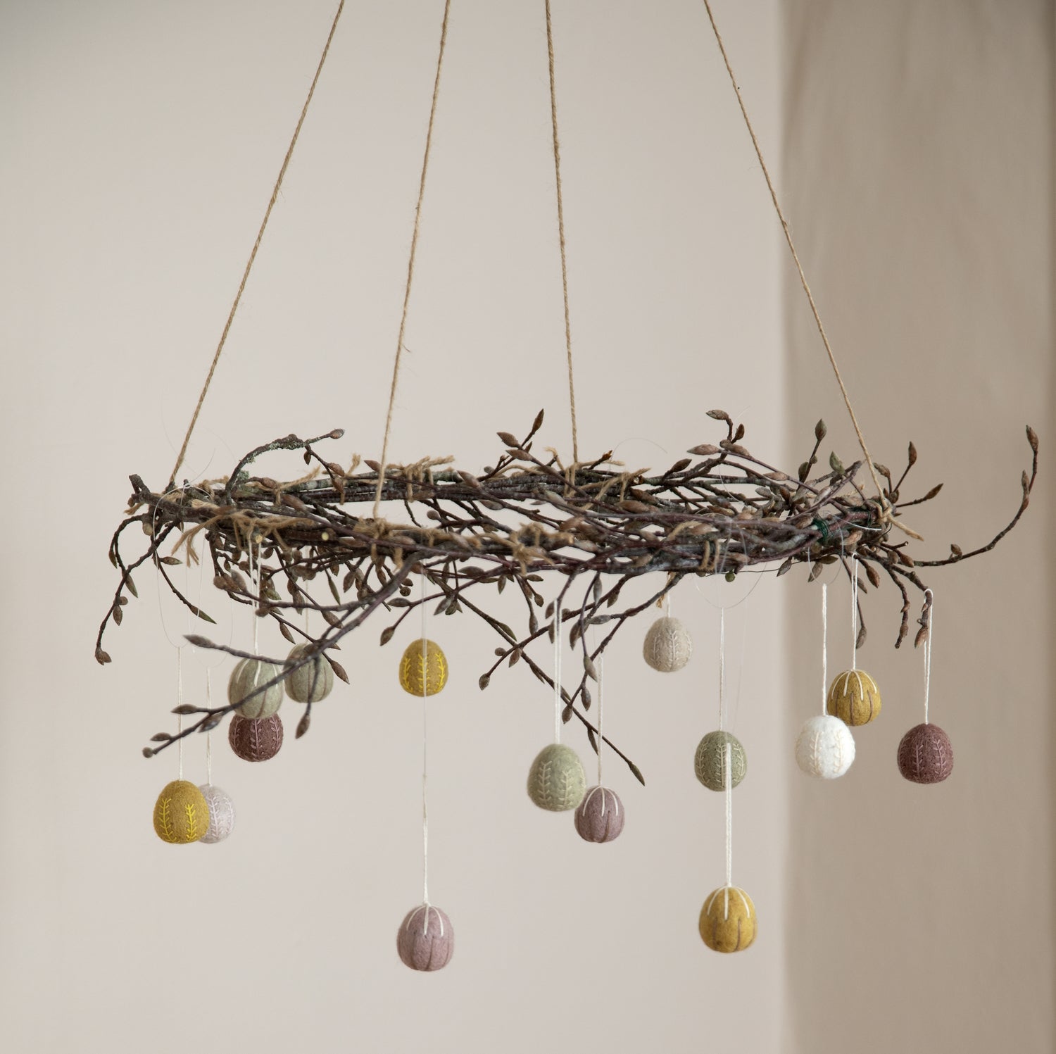 Pack of 8 mini felted wool hanging egg decorations, measuring 2.5cm in diameter each.