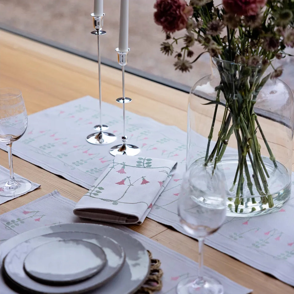 Linnea is characterized by stylized twin flowers and foliage, giving it a light and airy expression, which was typical of Stig's design during the late 60's. Made of 100% organic cotton. Measures 35x120cm.