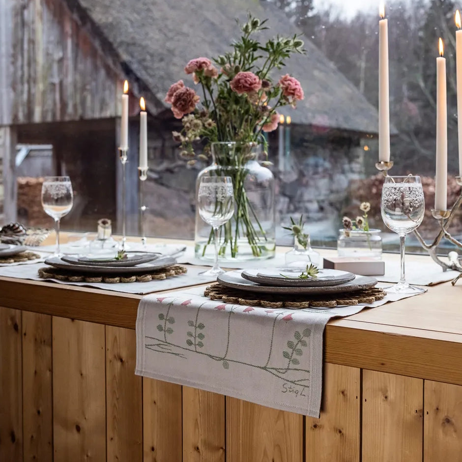 Linnea is characterized by stylized twin flowers and foliage, giving it a light and airy expression, which was typical of Stig's design during the late 60's. Made of 100% organic cotton. Measures 35x50cm.