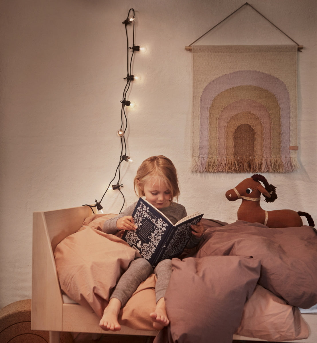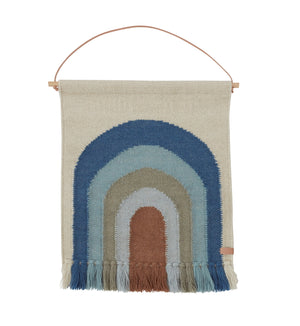This Follow The Rainbow Wall Rug in a smaller size will make for a charming and colourful wall decoration in your childs room. Hand-woven in bright colours and with fringes at the bottom. The upper part is folded on a stick with a string for hanging. Made of 80% wool and 20% cotton. Measures 69cm (H) x 55cm (W).