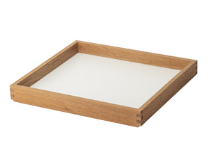 An extra tray for the Frame units. Made of a solid oak frame with a white lacquered MDF base. Measures 37.4cm (W) x 34cm (D) x 4.4cm (H). Weighs 1.3kg.