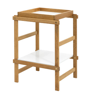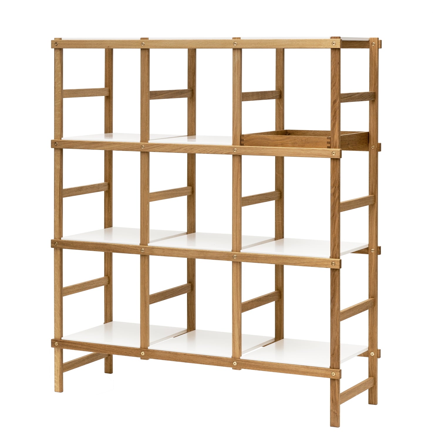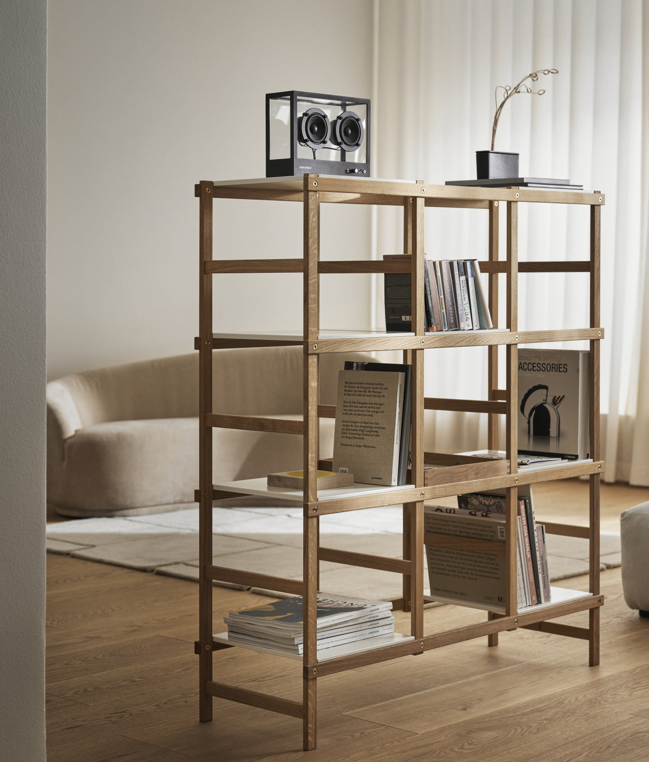 Frame is the perfect furniture system to display rather than store, and Harald Hermanrud see his design as a comment on social media, the need to express ones personality in order to fit into a culture. "I saw a need to put things on display, and I wanted to give people the opportunity to create the perfect scene for their most valued artworks, LP’s, books, and plants all by themselves". Frame manages this function in an extremely flexible manner where mathematical precision allows the grid-construction to carry shelves, trays and boxes that are easily moved around. Small objects can be framed and exposed, while larger objects can shoot out through the construction. Made of profiled sticks that are countersunk into each other, Frame manages to be light yet sturdy. And of course, truly Scandinavian all-in wood with attention on the joinery. There is of course a twist: the exposed solid brass rivet nuts capture the light and makes for a readable construction.