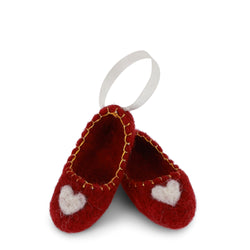 Crafted from 100% New Zealand wool, each slipper is needle-felted by hand in rich Christmas red, delicately stitched with golden thread and finished with a sweet white heart motif on the toes. A soft hanging loop connects the pair, making it easy to display on a tree, garland or special gift.