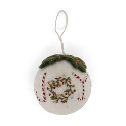 Made from 100% New Zealand wool, the soft white bauble features the word “JOY” hand-stitched in festive red thread, with a charming wreath forming the ‘O’. The top is finished with layered green felt leaves and subtle embroidery, giving it a natural and tactile look that feels right at home on a Scandinavian-style tree.
