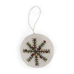 Made from 100% New Zealand wool, each bauble is needle felted and embroidered by hand, resulting in a soft, textured piece that feels both natural and nostalgic. The snowflake design stands out against a snowy white felt background, creating a subtle yet striking look perfect for Nordic or woodland inspired themes.