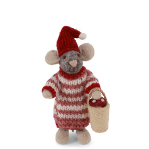 Lovingly handcrafted from 100% New Zealand wool, this grey felt mouse features a hand-knitted green and cream striped jumper, red trousers and a classic red Santa hat with a pom-pom. He carries a cream felt basket holding a red-and-white spotted mushroom, adding a magical forest-inspired touch.