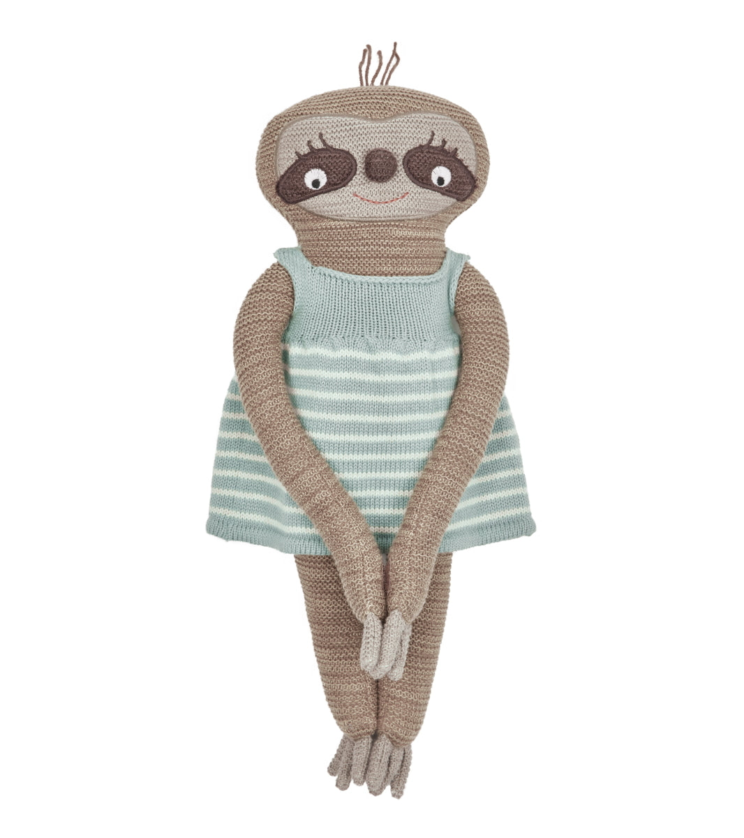 Sloths are known for their slow movement and lazy behaviour, which makes them perfect for hugging and being a nighttime buddy. During the day, you can hang them hanging upside for some play. Hanna's arms and feet have attached Velcro. You can dress up Hanna in doll clothes, as her dress is removable. Made of 100% cotton and filled with recycled polyester. Measures 42cm (L) x 24cm (W) x 14cm (D).