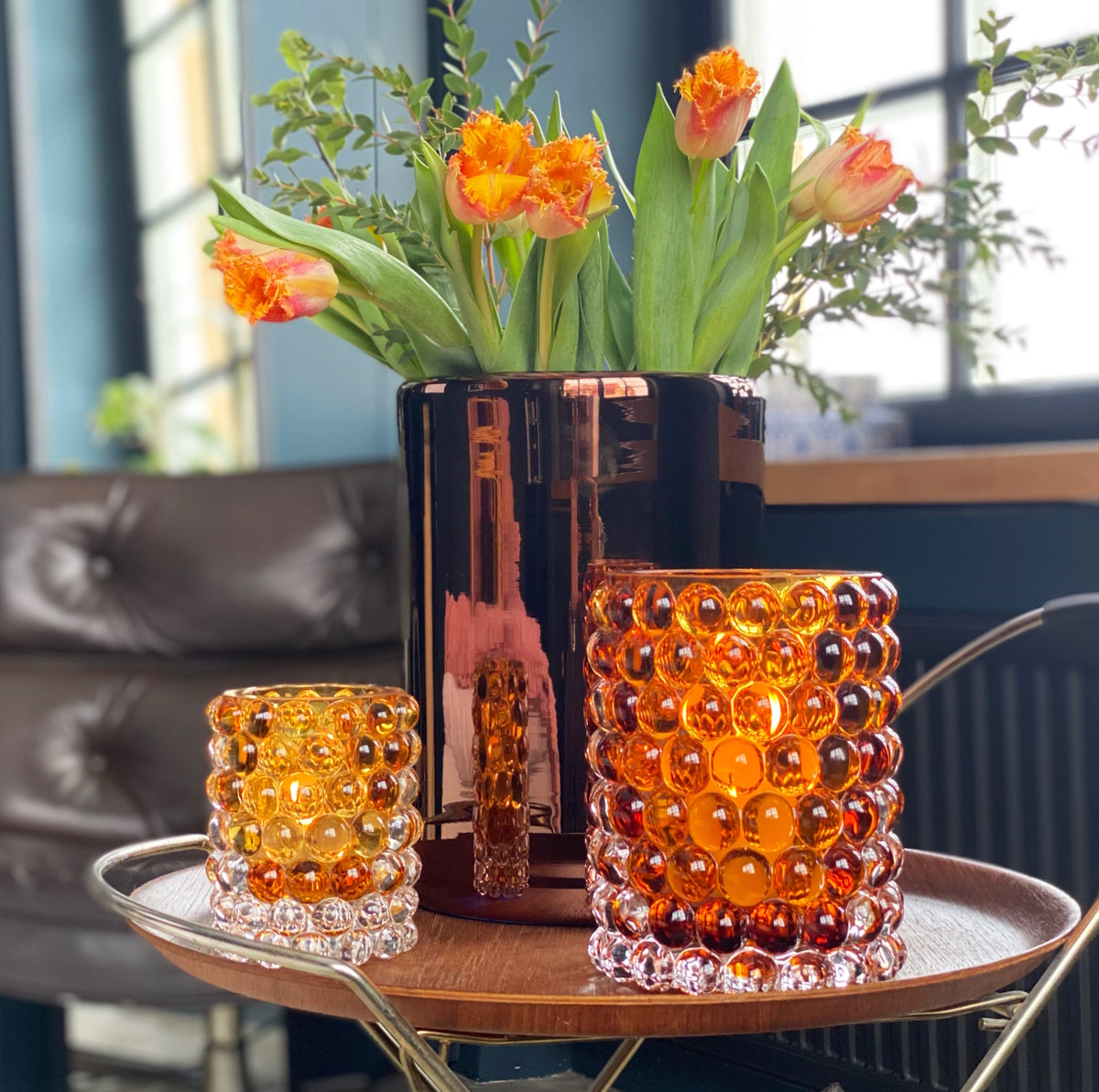 Hurricane Boule is hand-blown in Bohemia, home to the world's best glassblowers. The bubbles, created in a cast-iron mould, give Hurricane Boule it's own unique optic pattern and a luxurious weighty feel. It can also be used as a beautiful vase. Measures 18cm (H) x 13cm (Dia). Weighs between 2.7kg - 3.5kg. Recommended to use a 5cm diameter paraffin candle. Please click here for care instructions.