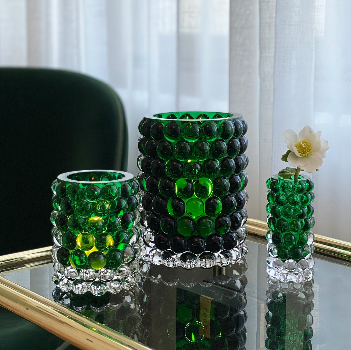 Hurricane Boule Mini is a beautiful small vase that is hand-blown in Bohemia, home to the world's best glassblowers. The bubbles, created in a cast-iron mould, give Hurricane Boule its own unique optic pattern and a luxurious weighty feel. Measures 11cm (H) x 4cm (Dia). Please click here for care instructions.