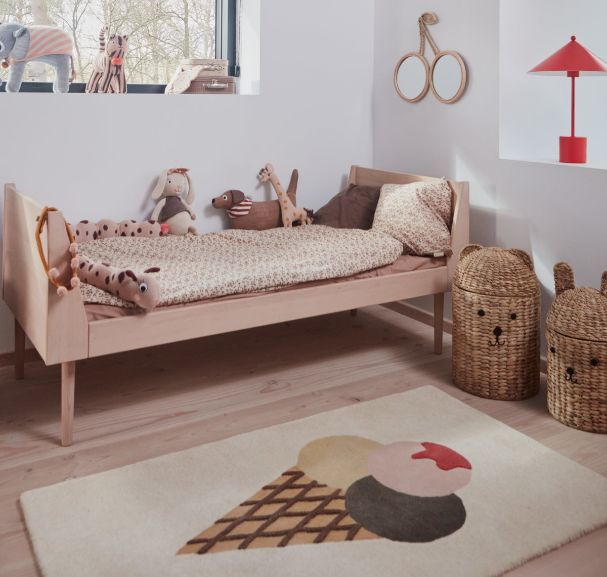 Keep small feet warm with the cute Ice Cream Tufted Rug and use it for hours of playtime on the floor. The rug is made of 80% wool and 20% cotton. The Ice Cream has a 3D effect to give the rug tactile properties. Measures 140cm (L) x 80cm (W).