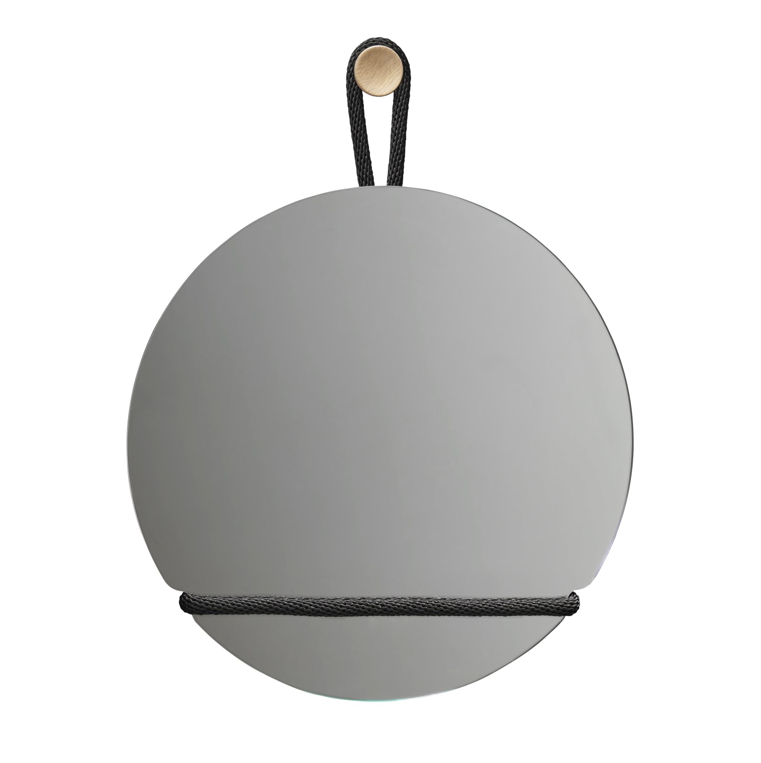 Material: Mirror glass 4.7mm. Galvanized iron back plate with black powder coating. Nylon rope. Oak knob. Measures 50cm in diameter. Weighs 3.5kg.