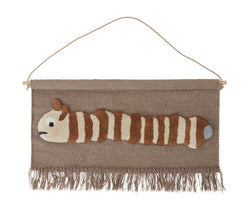 The wall rug series is a fun and playful way to decorate a children's room. The leopard has a dimensional effect that can be fun and challenging for the child's tactility. The rug is handmade in wool & cotton mix and can be hung on the wall with the included stick and leather string. Measures 44cm (H) x 73cm (W).