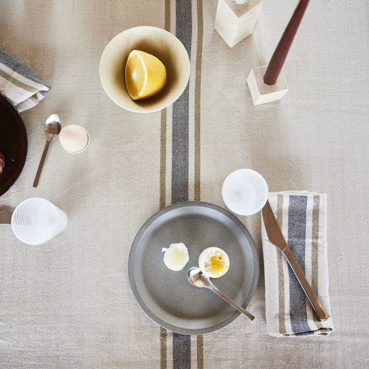 The Linu Tablecloth is a highlight of the Linu series crafted from organic cotton and Oeko-Tex polyester filling. Adorned with a herringbone weave and a simple design featuring a variation of different stripes, this tablecloth is available in two sizes for versatile styling. Mix and match with the Linu Napkins to create a personalized and elegant dining setting.