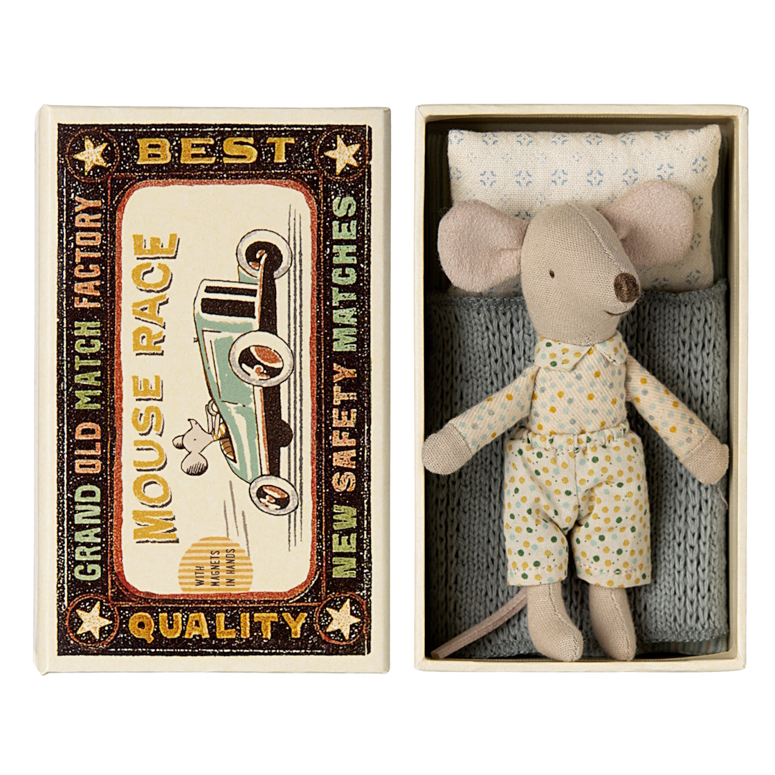A classic Maileg item. This mouse is ready for hours of play and sleeps snuggly in their little matchbox. The clothes and bedlinen are made of soft fabrics with unique prints in beautiful colours. Extend the story by adding accessories from the Maileg range. Measures 11cm in length.