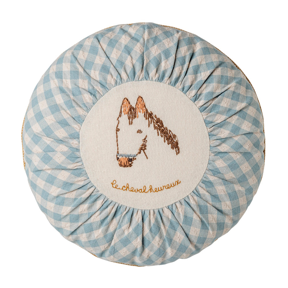 A soft round cushion with a beautiful, embroidered detail in the middle. The cover is made of cotton and it has an inner cushion with a soft filling. Measures 26cm in diameter.