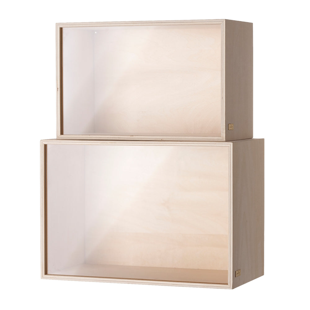 Comes as a set of two. A small and a large box, perfectly sized for Maileg mice and their tiny furniture and accessories. Each box features a sliding plexiglass front, allowing you to easily arrange your display. The boxes also have two small holes and a discreet groove at the back for adding a string of fairy lights (not included) for a warm and cozy glow.