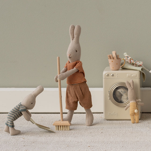 With this miniature broom set, your Maileg friends are ready to clean up once play time is over. The dustpan comes in a warm silver colour with a wooden broom. Length of broom is 17.5cm.