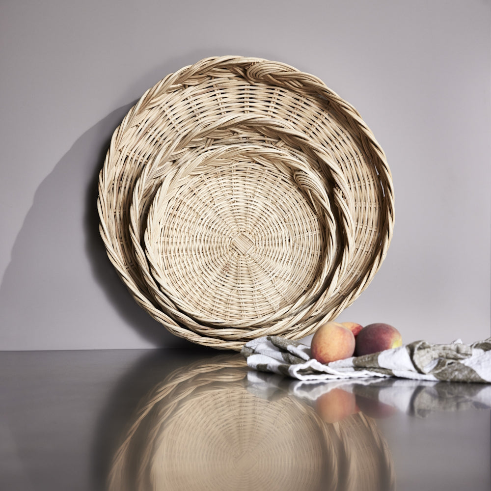 The Maru Bread Baskets are a perfect blend of elegance and functionality. Handcrafted with utmost care and attention to detail, this beautiful bread basket is designed to elevate your dining experience and add a touch of rustic charm to your table setting. Maru means circle in Japanese and the organic shapes create a beautiful contrast to the coarse rattan wicker. Available in three sizes. Made of 100% Rattan. Measures 28cm (Dia) x 7cm (H).