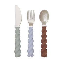 The sweet Mellow cutlery is made of stainless steel with a silicone handle. The set consists of a fork, spoon and knife, all of which have a handle with the recognizable Mellow twist, which gives little hand a good grip. Ideal as the very first piece of cutlery and wonderfully easy to clean as it is dishwasher safe. Measuring between 13cm & 14.5cm in length.