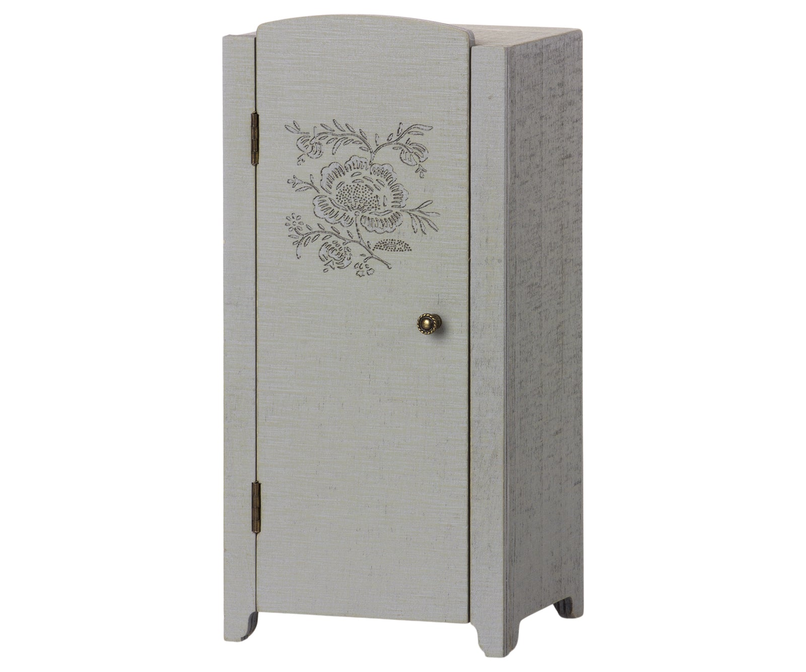 This wooden cabinet with a vintage look has a beautiful floral print on the front and wallpaper inside. A perfect place to store your small Maileg accessories. This closet fits into the Doll House. Measures H23cm x W11cm.