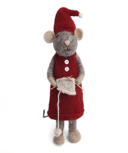 Meet the Gry & Sif Mouse Girl Extra Large Grey Knitting – a beautifully handcrafted felt mouse that embodies the cosy charm of Scandinavian design. This endearing mouse is dressed in a vibrant red knitted dress with sweet white buttons, crowned with a festive red Santa hat and busy knitting a soft cream scarf, complete with miniature wooden knitting needles and trailing yarn. Decoration measures 60cm in length.