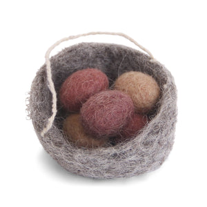 Handmade felted nest basket with mini eggs, measuring 5cm.