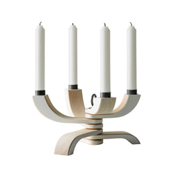 The Nordic Light Candle Holder 4 in white by Design House Stockholm is a bestselling piece that combines functional design with strong visual impact. Designed by Jonas Grundell, this folding candle holder is crafted from beechwood with a white lacquer finish and matte black candle cups for a modern contrast. Each arm pivots out individually, allowing for versatile styling and folds flat for easy merchandising, shipping, or storage.