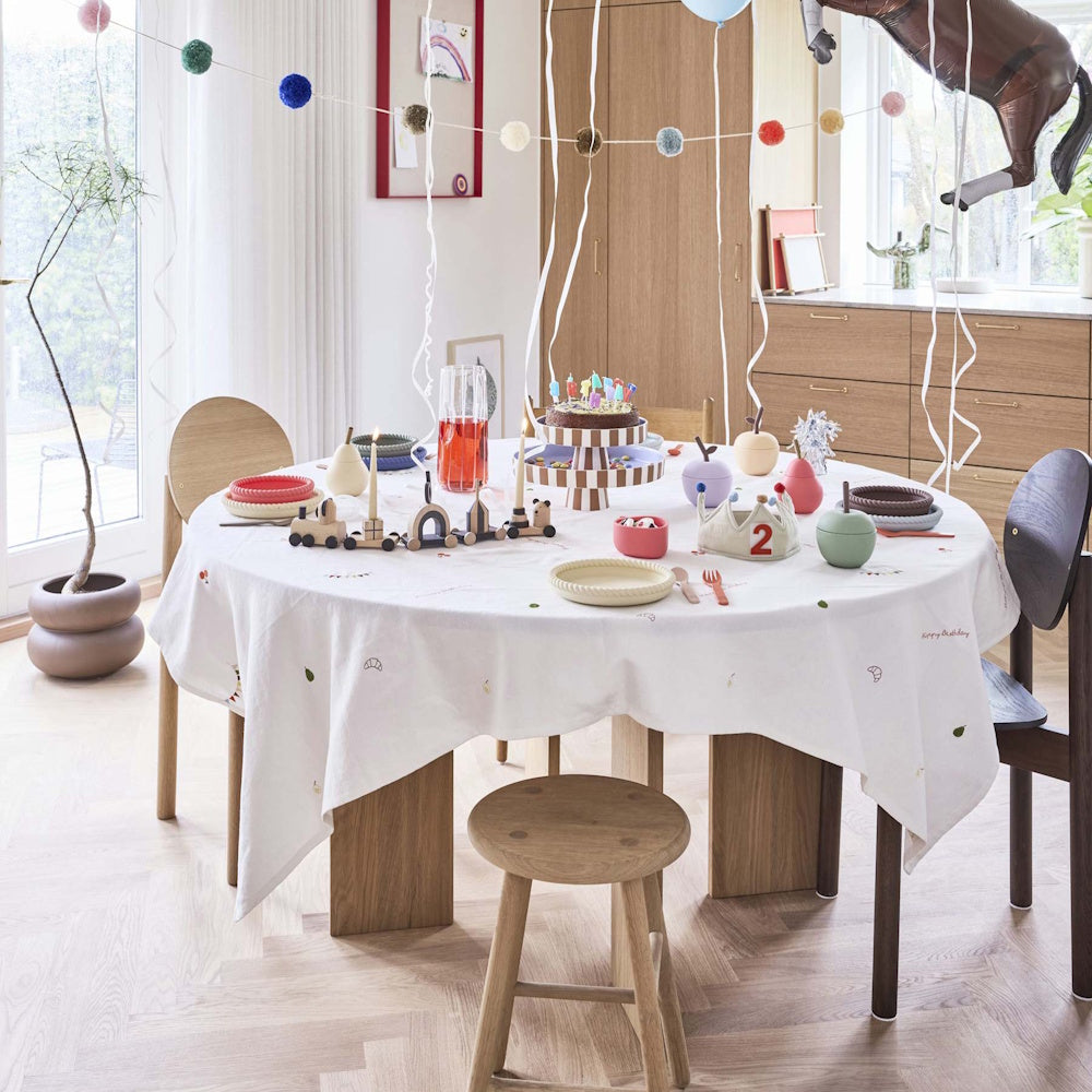 Perfect for birthdays and festive occasions, the Birthday Tablecloth brings a joyful and vibrant touch to your celebrations. Its square shape drapes beautifully over round tables, creating a cheerful centrepiece for party settings. Adorned with playful, festive illustrations, it’s made from 100% OEKO-TEX certified cotton - designed to be reused and treasured year after year as part of your family traditions. Measures 160cm square.