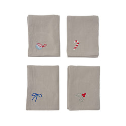 The Christmas Napkin set of four is each adorned with adorable holiday illustrations. Elevate your festive table setting with these charming and practical napkins. Perfect for adding a whimsical flair to your Christmas gatherings. Made of 100% organic cotton. Measures 45cm square.