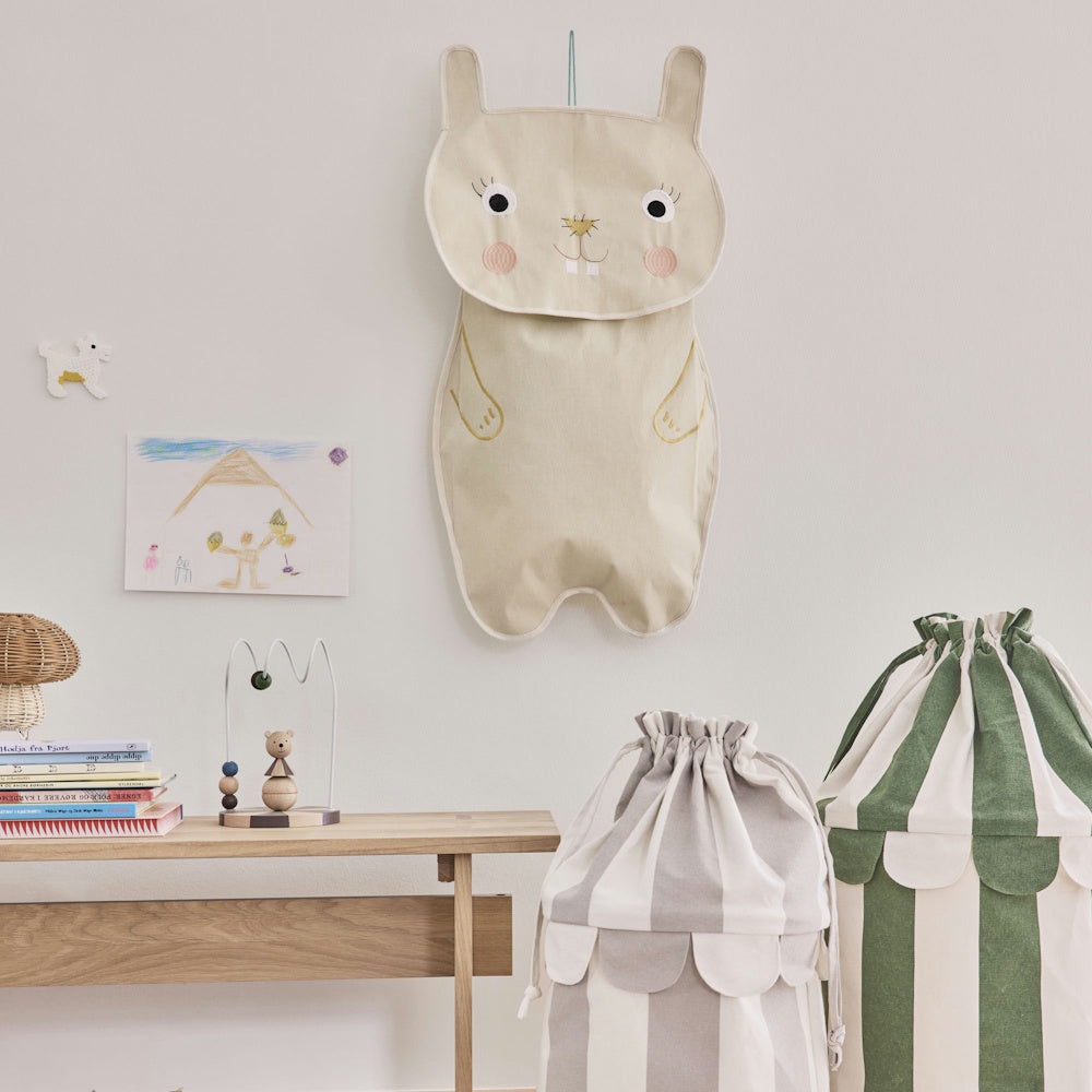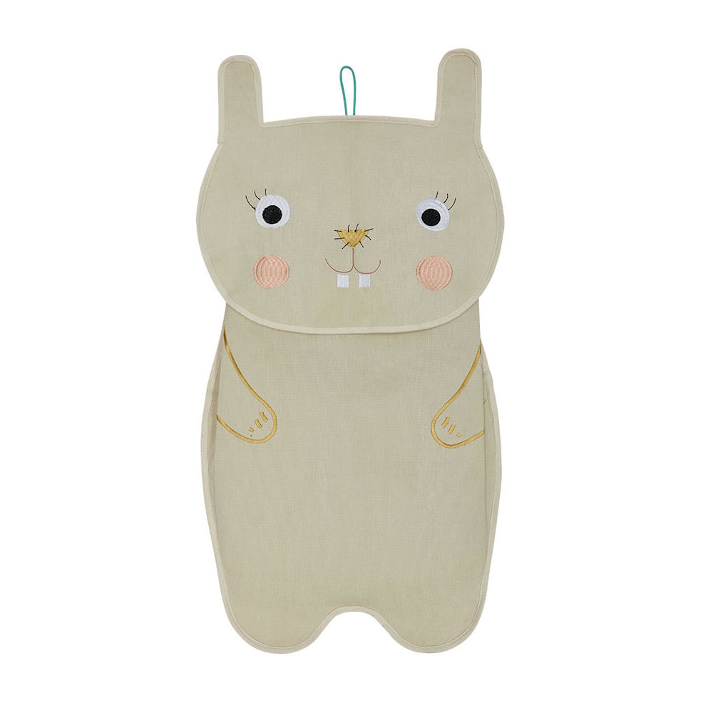 The Darling Rabbit Wall Storage is a charming and functional solution for keeping children’s spaces tidy. Crafted from cotton with a PE-coated backside for added durability, it’s ideal for storing small toys, books, accessories or everyday essentials. The front features a sweet, embroidered rabbit face that adds a playful touch to any nursery or kids’ room. Designed with a nylon loop for easy wall hanging, this storage piece blends practicality with whimsical style - making organisation fun and decorative. Measures L77cm x W40cm.