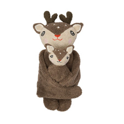 The Dea & Baby Dac Deer is a charming and cozy stuffed toy made of soft terry cotton. This adorable design features a mother deer lovingly holding her baby in a pocket, allowing for a comforting cuddle. Perfect for snuggling, this plush toy is ideal for kids to enjoy. Measures L31cm x W14.5cm x H8cm.