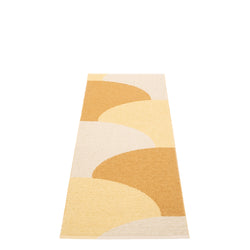 The Hill rug by Pappelina pays tribute to the soft movement and golden tones found in nature. With layered waves in ochre, pale yellow, and cream, this contemporary design brings warmth and subtle sophistication to any space. Ideal for retailers seeking a statement piece that blends visual appeal with everyday functionality.