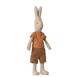 A classic rabbit made of soft natural linen and cotton fabric that gives a lovely look and feel. Size 1 rabbits fit into the Maileg doll house and all furniture size Mini. Buy loose clothes separately to expand the rabbit's wardrobe. Measures 24cm in length.