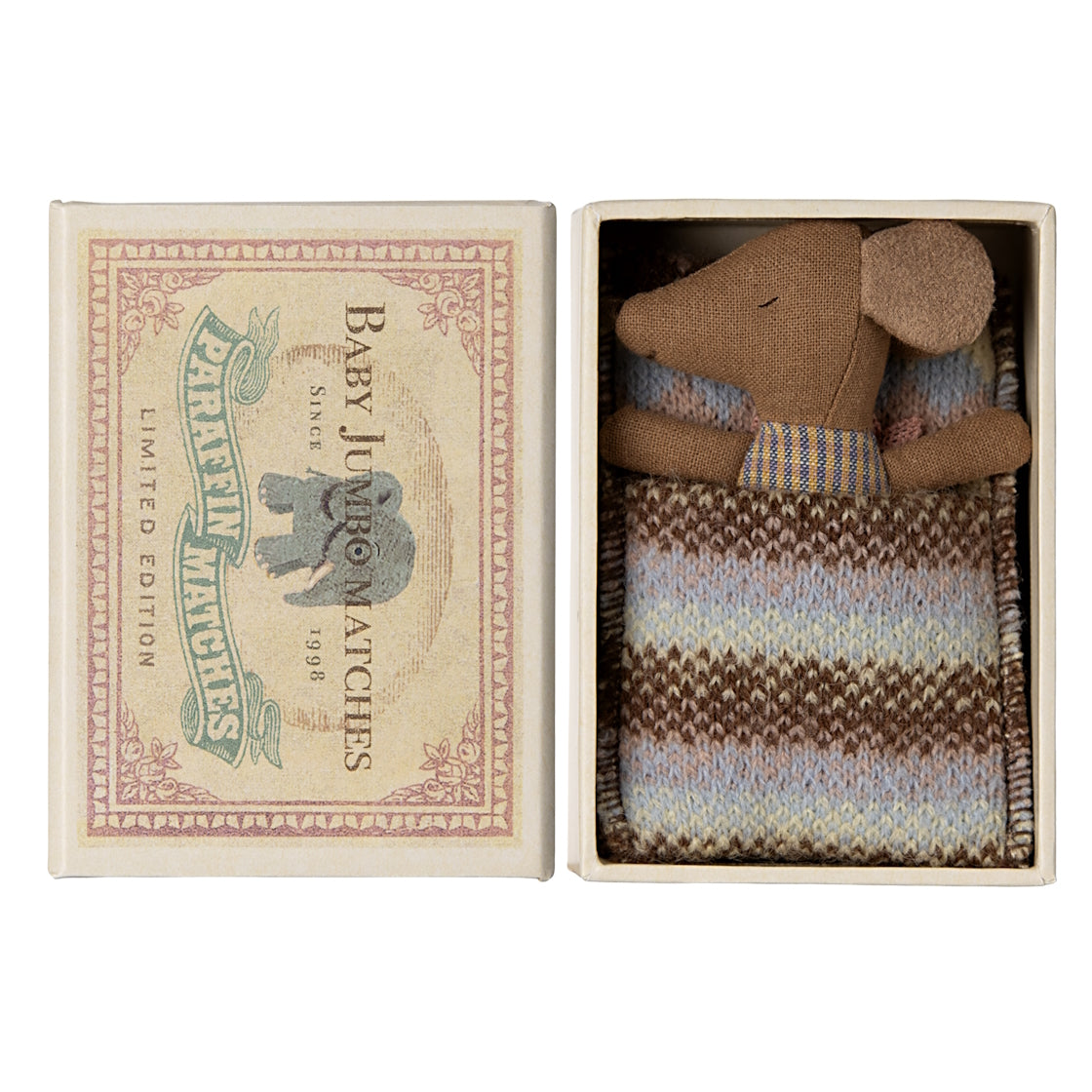 A classic Maileg item. This mouse is ready for hours of play and sleeps snuggly in their little matchbox. Sleepy Wakey sleeps soundly on one side, and is awake on the other side. The clothes and bedlinen are made of soft fabrics with unique prints in beautiful colours. Measures 8cm in length.