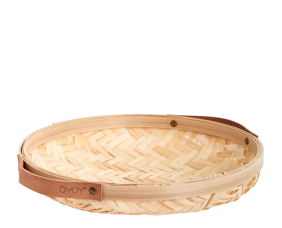 The round Sporta Basket has a stylish look and will make an elegant and chic item on your kitchen bench or dining table. Made of bamboo with a leather handle. Measures 30cm in diameter and 5.5cm in height.