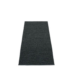 The Svea Black rug is a signature piece in the Pappelina collection, known for its refined simplicity and textural elegance. Made in Black and Black Metallic, it features a unique woven structure that alternates matte and metallic PVC ribbons in the same tone. This subtle contrast adds a luxurious shimmer and depth, creating a bold yet sophisticated look that enhances any space.