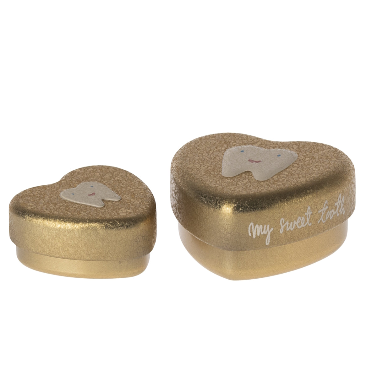 These little heart-shaped tins have lids with a pressed out image of a smiley tooth. Measures 2.5cm (H) x 5cm (W).