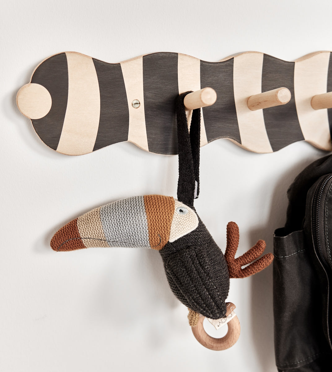 Let your child relax with the sweet Toucan Music Mobile. The music is soft and gentle, and will certainly help the child fall asleep. The music starts when the small wooden ring is pulled down. The music mobile is sure to create smiles and joy. Measures L20cm x W12cm H8cm. Made of cotton with recycled polyester filling.