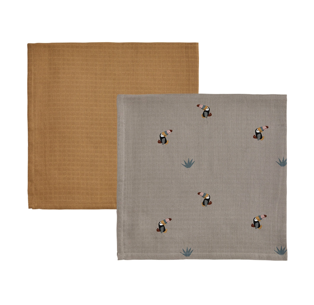 The Toucan Muslin is a must-have for every parent. This pack of two muslins ensures you're always prepared. One muslin features a delightful print with a well-known OYOY animal, while the other boasts a soothing plain colour. Made from 100% organic cotton, these muslins offer a soft touch for your baby's delicate skin. Measures 70cm square each.